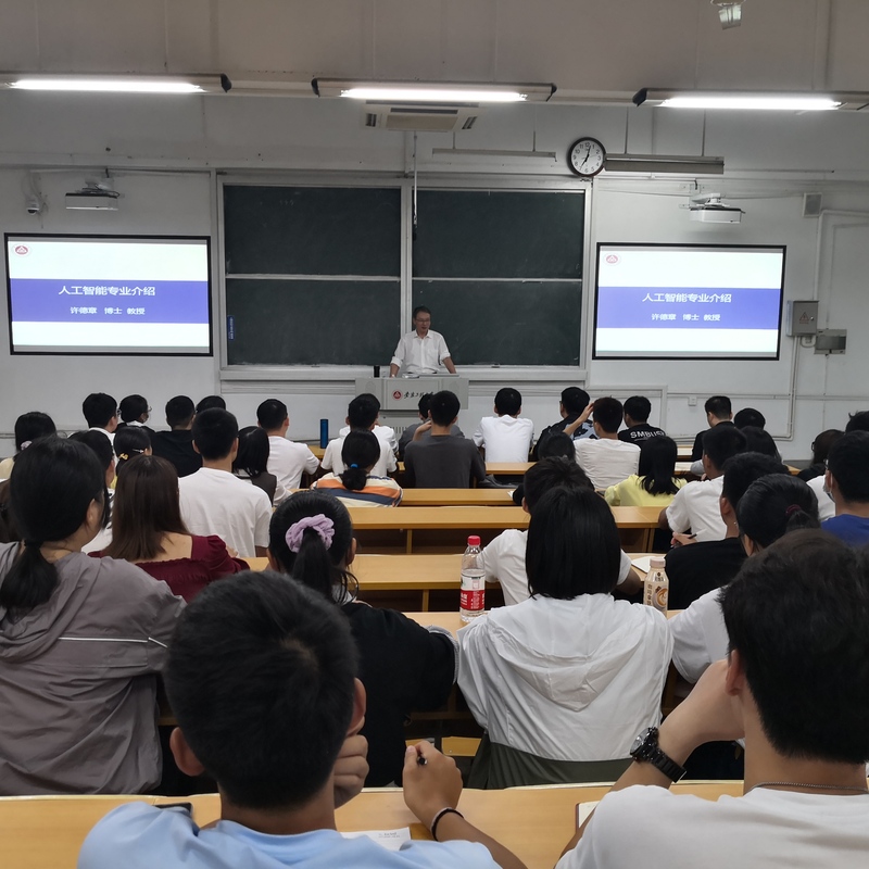 9月22日晚,在2教207教室,“五一劳动奖章”获得者、省教学名师、 有声小说 执行院长许德章教授带领系部全体教师,分别为人工智能专业、智能科学与技术专业做介绍,从 有声小说概况 、专业背景、专业定位与培养目标、课程体系等五方面进行详细说明,又对广大新生寄语:践行我校的“尚德敏学、唯实维新”的校训,诚实做人,踏实做事,扎实做学问,在不断的追求和奋斗中提升自我。会后,两个专业的本科生导师又和大家亲切交谈,通过建立QQ群等方式,搭建起导师与新生的沟通平台。