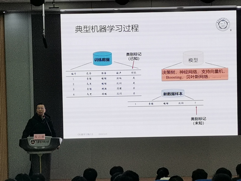 开班仪式后,特邀专家中国科学技术大学连德富教授作了“人工智能基础技术与工程应用现状”的精彩报告,他介绍了人工智能技术的发展历程和技术框架,以机器学习为核心,结合图片搜索、手写字符识别、智能创作、下棋、自动驾驶等生动应用案例阐述了人工智能的关键技术,让在场师生在轻松愉快的氛围中深刻感受到人工智能技术的发展魅力。