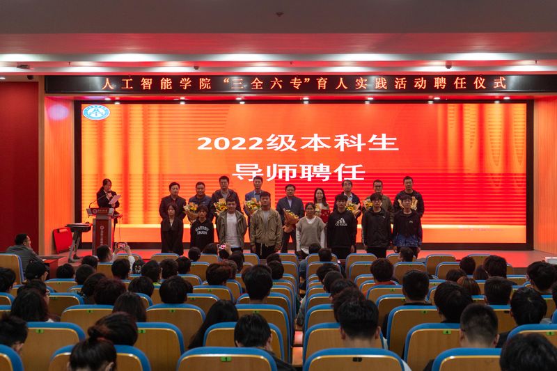 江本赤为2022级本科生导师及学院“三全六专”育人工作“名师智囊团”成员颁发聘书。智能制造工程系系主任刘玉飞作为“名师智囊团”教师代表发言,他在发言中回顾了自己读大学期间的学习与成长经历,代表“名师智囊团”全体被聘任教师对学院党委的信任和给予的机会表示感谢,他呼吁全体教师要做好“三全六专”育人工作过程中的积极参与者和勇毅担当者,以党的二十大精神为指导,自觉把个人的发展同学院、学校的发展相结合,落实立德树人根本任务,以不懈奋斗者和忠诚实践者的姿态助力学校高质量发展。