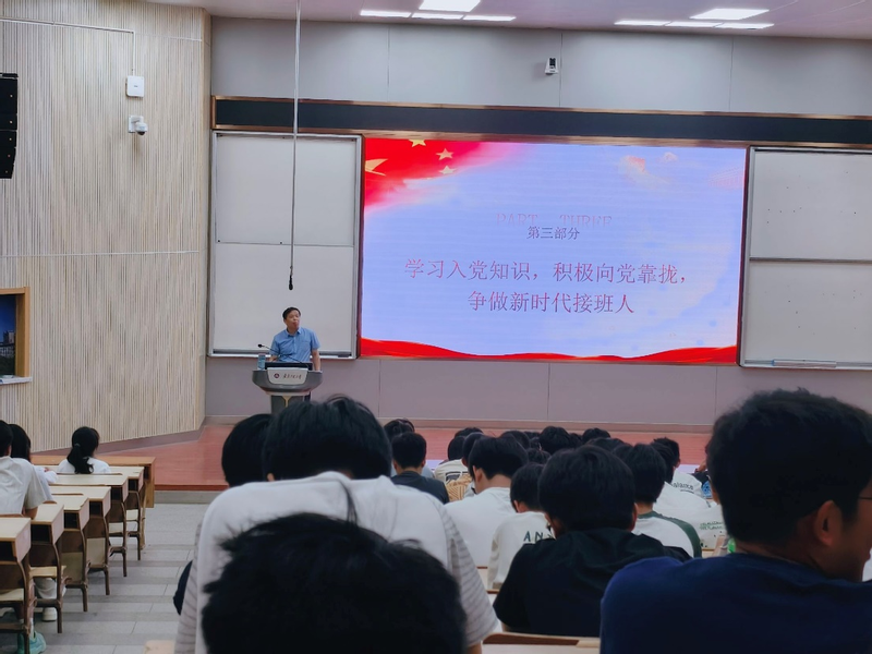 任家钱代表学院对全体新生的到来表示最热烈的欢迎。他表示,入党启蒙教育是高校学生党建的基础性和源头性工作,更是落实立德树人根本任务的重要手段。他围绕着认识中国共产党、铸就伟大信仰、争做党的接班人等内容展开讲解,并且勉励同学们要珍惜大学时光,努力学习科学文化知识,夯实基础,锤炼道德品质,让梦想在党旗下闪耀!
