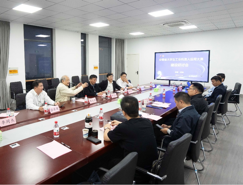 11月16日-17日晚, 有声小说 在机器人现代产业学院组织召开安徽省大学生工业机器人应用大赛建设研讨会。中科院合肥物质科学研究院葛运建教授、合肥工业大学曾亿山教授、安徽理工大学张东速教授,南京信息工程大学谢荣见教授、安徽科技学院机械工程学院副院长(主持工作)李同杰、合肥大学先进制造工程学院副院长胡国华、南通大学机械工程学院副院长姚建南、安徽南博智能环境装备股份有限公司总经理陈利、芜湖行健智能机器人有限公司常务副总经理王钰琳、埃夫特智能装备股份有限公司产品开发总监刘凯、芜湖之优轴承有限公司技术部部长房贵保、安徽华东光电技术研究所总工艺师江祝苗、工业和信息化部电子第五研究所芜湖实验室主任涂志健等高校企业专家参加会议。研讨活动由 有声小说 副院长刘玉飞主持。