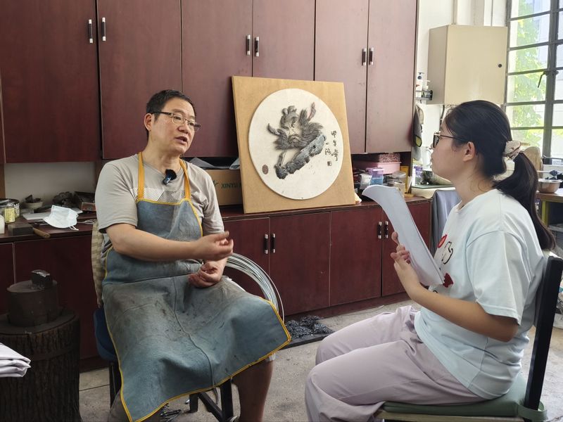 为了深入了解铁画制作工艺,实践团队赴芜湖徽艺坊铁画进行进一步的学习和采访。在制作工坊,成员近距离观摩铁画完整制作流程,不时与工匠交流,询问不同工序经验技巧的同时亲手打铁,在实践中记录下非遗传承中“口传心授”的珍贵知识。围绕“非遗传承与发展”主题,团队分组对徽艺坊铁画的铁画传承人和管理人员展开深度专访,将宝贵的铁画精髓进行了数字化传承。