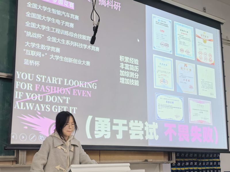 宣讲环节,退役士兵王浩稳以军旅生涯为切入点,讲述携笔从戎、保家卫国的热血历程,分享军人作风对学业与品格的塑造,鼓励同学们心怀家国、勇担使命,在青春赛道上不畏艰难、砥砺前行。考研优秀者刘航聚焦备考全过程,分享时间管理、复习方法、心态调整等实用经验,勉励大家坚定目标、持之以恒,用奋斗圆梦理想院校。国家奖学金获得者刘海燕和黄安琪分别以勤学笃行为主线,分享专业学习、科研竞赛、综合素质提升的心得,倡导同学们珍惜时光、深耕学业,在追求卓越中实现全面发展。