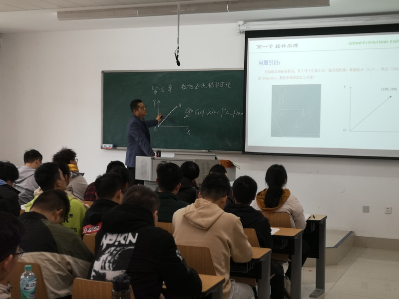 吴路路老师本次讲授课程为《数控机床》,主要讲授内容是数控系统插补原理。吴老师采用引导启发式教学模式,用“视频+问题”引出插补概念,并用板书和多媒体结合的方式,讲述逐点比较法直线插补原理,由浅入深,使抽象的原理方法变得直观易懂,学生现场反响热烈,整个课堂教学氛围十分活跃。